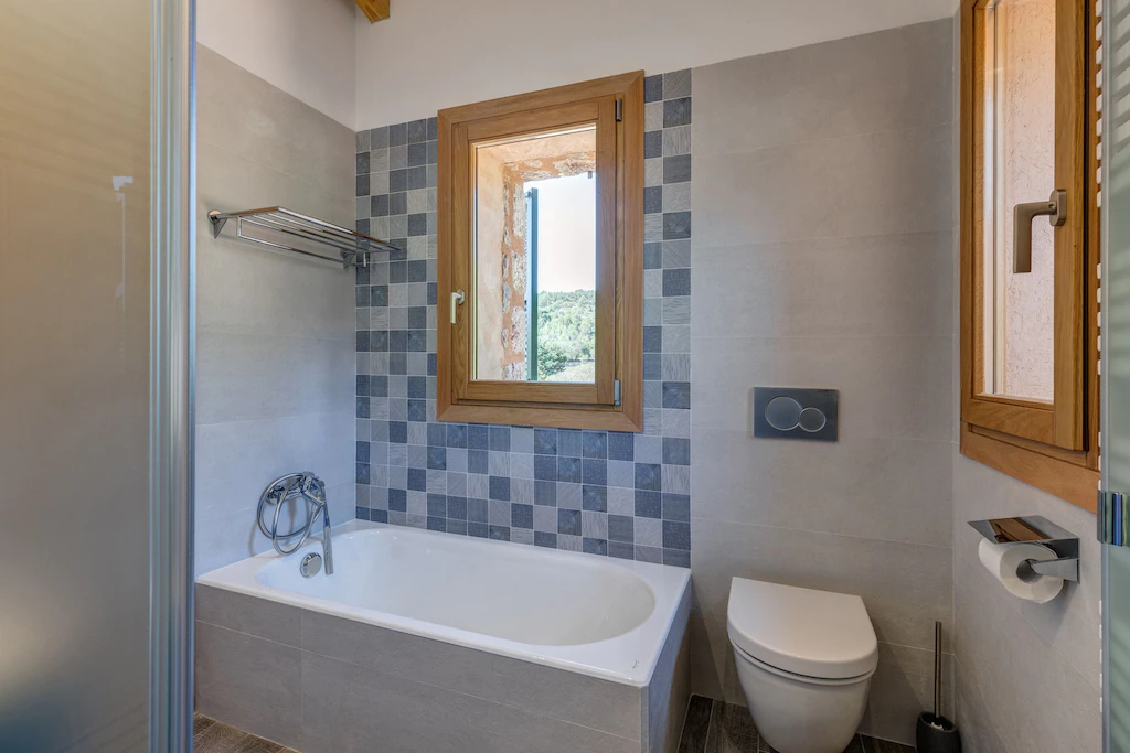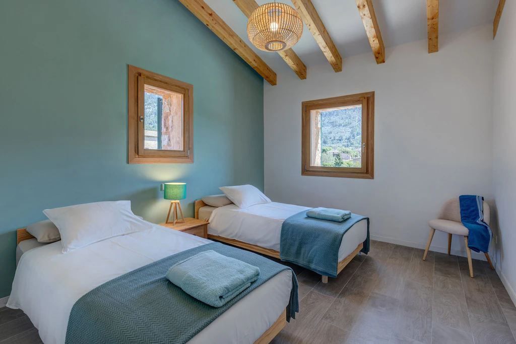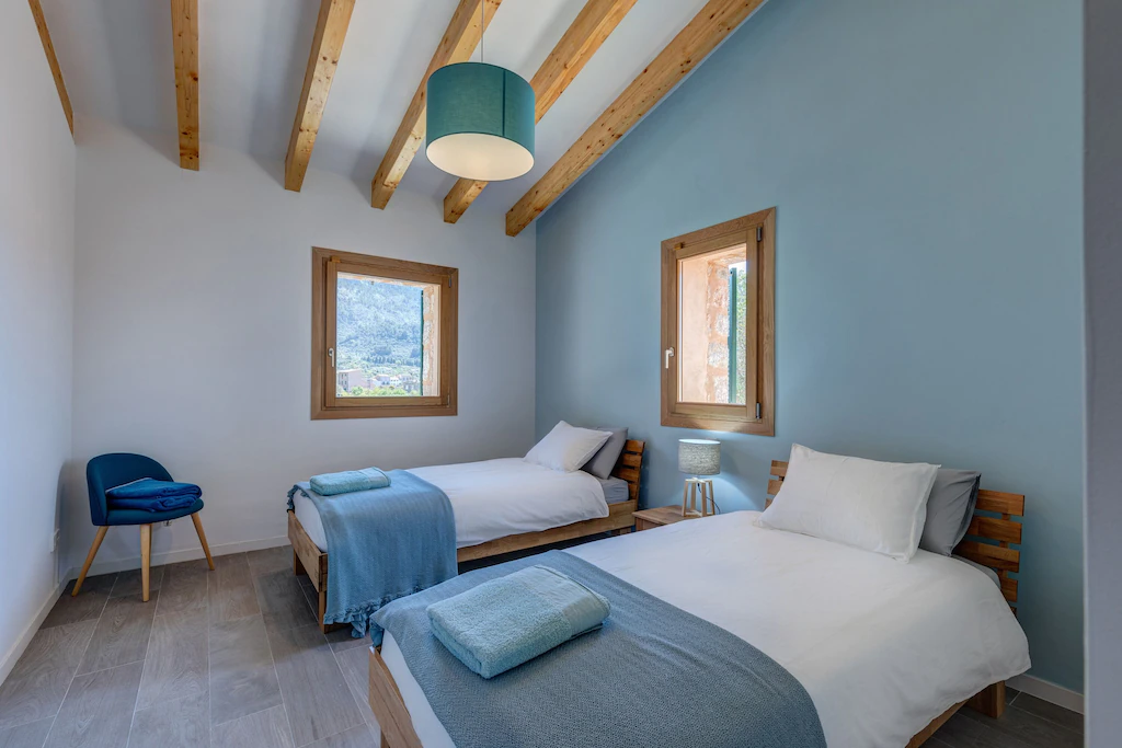 After climbing up the stairs made of mallorcan stone, you will be presented on the first floor with two other rooms with view on the mountains, each having 2 individual beds, that fit children as well as adults. A bathroom with a small bathtub and a shower is also present on that floor.
